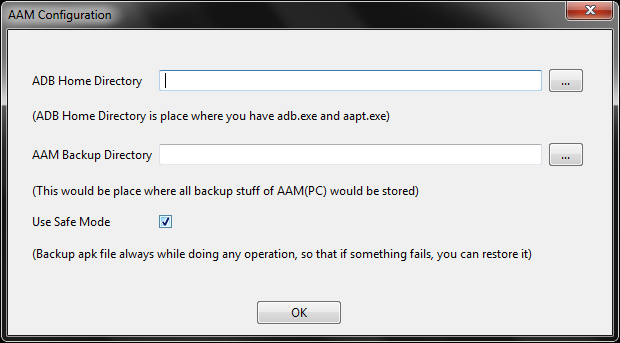 - When AAM runs for first time, it will ask for ADB home directory (where adb.exe and aapt.exe are present) and a directory for storing backup data.
