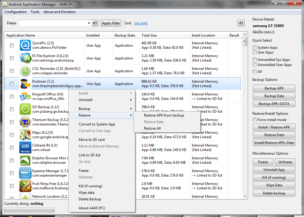 AAM is a tool by which yoy can manage your applications from your computer. Main aim is to take backup of system or user application (.apk file) as well as its data, which can be restored back - all form your computer. Basically I am replicating some of the Titanium backup functionality on this PC based tool.
