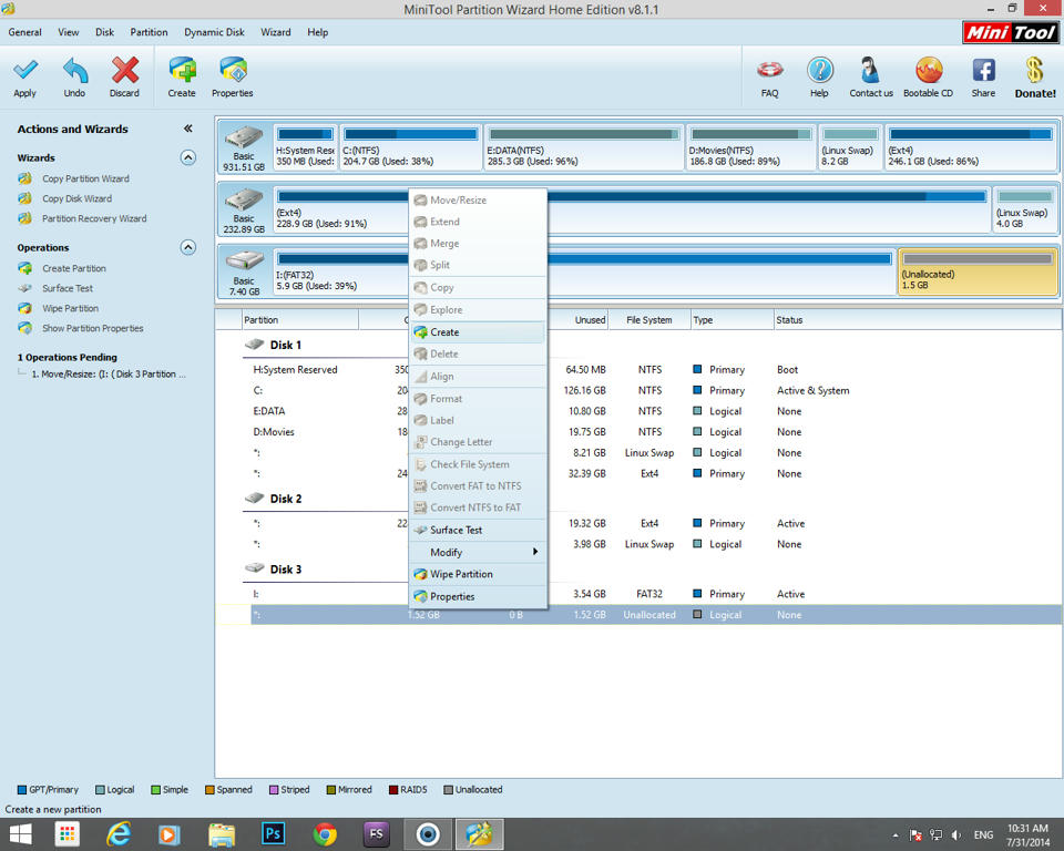 - Right click on unallocated space and select Create. Following this create ext4, swap and again ext4 partitions: